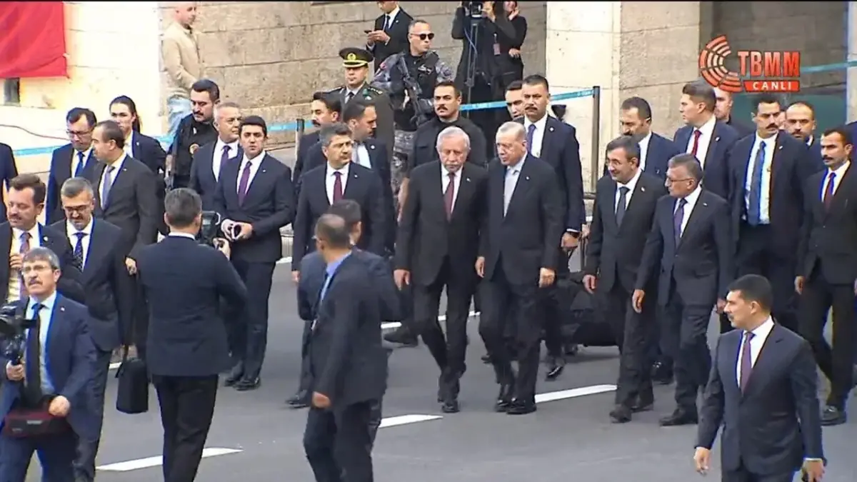 Cumhurbaşkanı Recep Tayyip Erdoğan’da açılış törenine katılmak üzere Meclis’e geldi. Erdoğan, Genel Kurul’da milletvekillerine hitap etmek üzere kürsüye çıktı. Ancak Cumhuriyet Halk Partisi (CHP) milletvekilleri, protesto amacıyla Genel Kurul’daki oturuma katılmadı. Türkiye İşçi Partisi (TİP) ve Emek Partisi (EMEP) milletvekilleri de protestoya destek vererek konuşmayı takip etmedi.