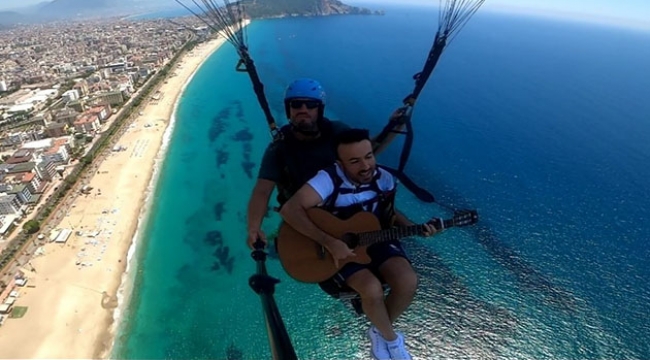 Antalya’nın Alanya ilçesinde pilot yardımıyla yamaç paraşütüyle uçuş yapan psikolog Serkan Çimen, gökyüzünde mini bir konser verdi. Denize 800 metre yükseklikte Çimen’in gitar çalıp ‘Aldırma deli gönlüm’ şarkısını söylemesi paraşütteki kameraya yansıdı