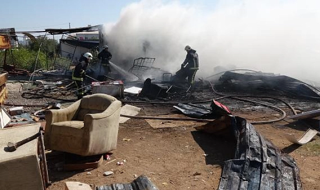 ANTALYA'da evsel eşya satılan spot mağazada çıkan yangında, ikinci el mobilyalar, iş yeri arazisi içerisindeki konteyner ile kamyonet yandı