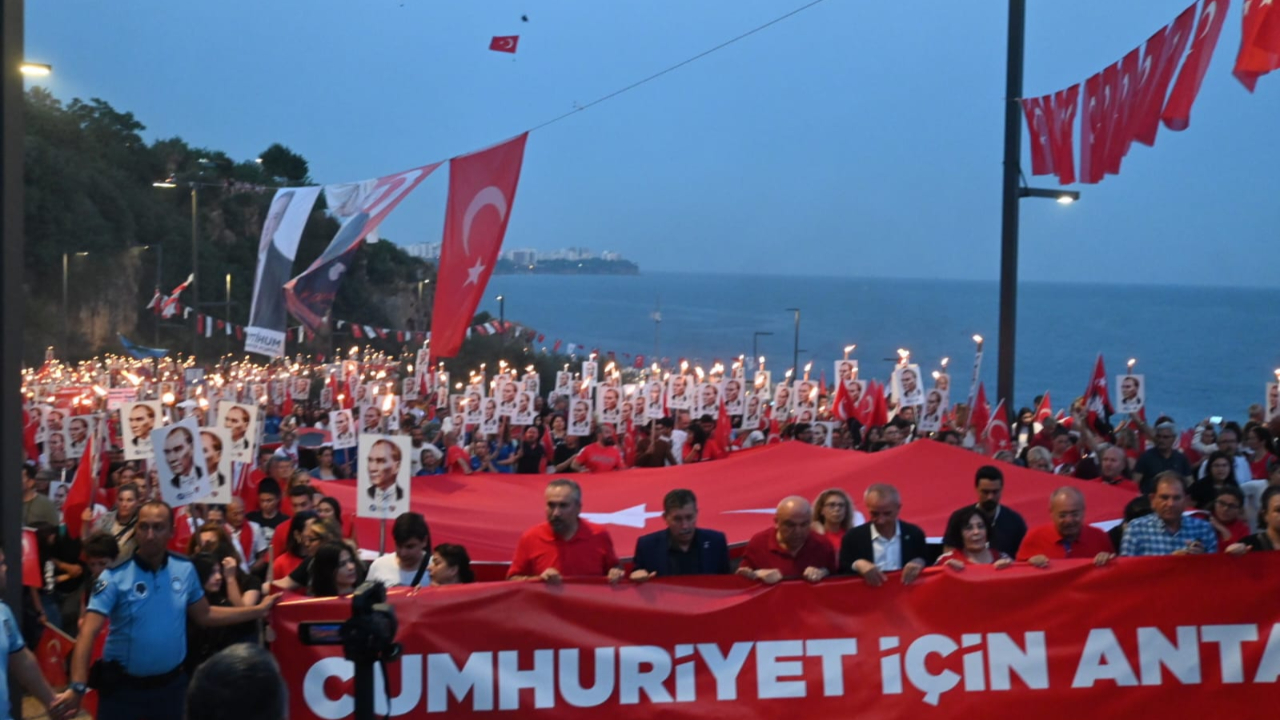Saat 20.00’de başlayan yürüyüş öncesi Konyaaltı Varyant çevresinde binlerce vatandaş bir araya gelmeye başladı. Ellerinde Türk bayrakları ve Atatürk posterleri taşıyan kalabalık, 400 metrelik dev Türk bayrağını omuz omuza taşıdı. Marşlar söylendi, sloganlar atıldı, gençler ve çocuklar omuzlarda taşınarak korteje renk kattı. Yürüyüşe kentte yaşayan yerleşik yabancıların da yoğun ilgi gösterdiği görüldü.