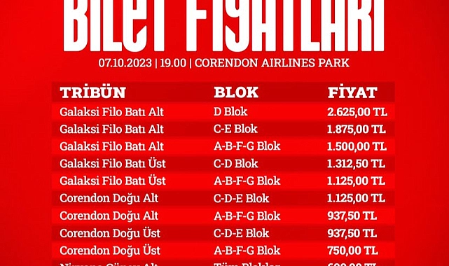 Antalyaspor Trendyol Süper Lig’in 8. haftasına sahasında Galatasaray ile oynayacağı maçın hazırlıları sürdürüyor. Öte yandan kulüp de bilet fiyatlarını açıkladı. Diğer maçlara göre daha yüksek olan fiyatlar 600 Türk Lirası ile 2625 Türk lirası arasında değişiyor. Kulüpten yapılan açıklamada: ‘‘Trendyol Süper Lig’in 8. haftasında Galatasaray ile oynayacağımız maçın biletleri satışa açıldı. Maç biletleri; Passolig gişelerinden yapılan alımlarda kadın, öğrenci ve engelli taraftarlarımıza yüzde 50 indirimli satılmaktadır. Ev sahibi takım tribünlerinde Galatasaray logolu Passolig kartlar hariç tüm Passolig kartlara bilet satışı yapılmaktadır’’ ifadeleri kullanıldı.