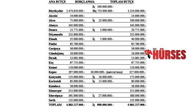 Bütünşehir Yasası ile birlikte 20 bin 723 km2’ye hizmet götürecek olan Büyükşehir Belediyesi’nin 2018 mali yılı tahmini gelir-gider bütçesi; 853 milyon lira iç ve dış borçlanma ile birlikte 3 milyar 210 bin lira olarak belirlendi. 2 milyon 222 bin 562 nüfusa hizmet götüren Büyükşehir Belediyesi’nin bütçesi nüfusa bölündüğü zaman kişi başı hizmet bin 444 lirayı geçmiyor. 19 merkez ilçe belediyesinin toplam tahmini gelir – gider bütçesi 2 milyar 481 milyon 706 bin 900 lira olarak belirlenirken, bu bütçenin 127 milyon lirası Aksu, Demre, Elmalı, Kepez, Konyaaltı, Korkuteli ve Muratpaşa Belediyeleri tarafından iç borçlanmayla karşılanacak.