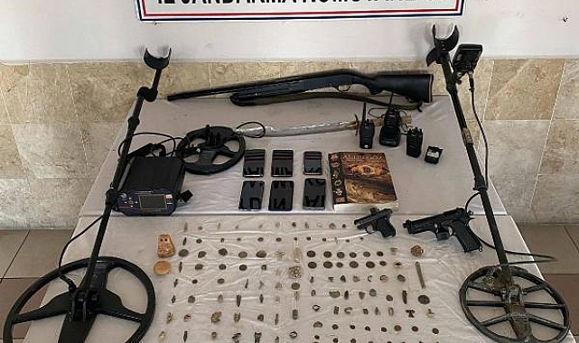 Aydın İl Jandarma Komutanlığı ekipleri, Aydın ve İzmir'de tarihi eser kaçakçılığı yapıldığı bilgisi üzerine çalışma başlattı. Yapılan çalışma sonucunda 2 ilde belirlenen 6 adrese dün akşam saatlerinde eş zamanlı operasyon düzenlendi. Adreslerdeki aramalarda tarihi eser olduğu değerlendirilen kılıç, 175 obje ve sikke, tarihi eser işaret ve sembolleri yazılı kitap, 2 dedektör, 3 el telsizi, 4 telsiz bataryası, 2 ruhsatsız tabanca, ruhsatsız tüfek ve 6 cep telefonu ele geçirildi. Olayla ilgili Ö.Ö., İ.E.Ç., H.Y.T., H.İ.G., B.Ö. ve M.Ç. gözaltına alındı.