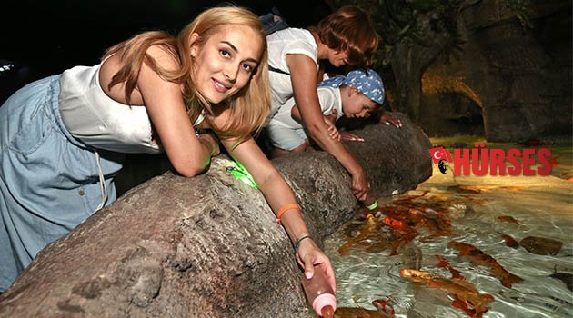 Akvaryum Genel Müdürü Kemal Kumkumoğlu, her gün aynı saatte yapılan 'koi' balıklarını biberonla besleme etkinliğinin büyük ilgi gördüğünü söyledi. Ziyaretçilerin birçoğunun giriş saatlerini beslenme saatine göre ayarladığını vurgulayan Kumkumoğlu, "Bu balıkları bebek gibi besliyoruz. Katılımcılarda inanılmaz heyecan yaratıyor. Bakıcılarımız özel hazırladıkları sıvı balık mamalarını biberonlara koyuyor. 'Koi' balık havuzu önünde bekleyen ziyaretçiler, biberonlarla balıkları beslemenin heyecanını yaşıyor. Biberonu emen balıklar, dakikalar içinde yemi bitiriyor" dedi. Amaçlarının turistlerin balıklara yakınlaşmasını sağlamak olduğunu vurgulayan Kumkumoğlu, "Akvaryumda 5 binin üzerinde balık bulunuyor. Fakat insanlar bu balıklara dokunamıyor. Koi balıkları ise bu isteklerini karşılıyor. Balıkların biberondan yem yedikleri andaki dokunuşları turistleri mutlu ediyor. Koi balıkları da insanlara yakın sakin deniz canlıları. Biberonu da çok seviyorlar" diye konuştu. Kemal Kumkumoğlu yine her gün saat 12.00'de akvaryumdaki 180 köpekbalığı için de besleme şovu yaptıklarını kaydetti.