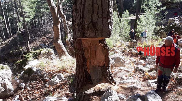 Antalya'nın doğa yürüyüşü ve dağcılık gruplarından Özgür Rotalar Dağcılık ve Doğa Sporları (ÖRDOS) üyeleri, geçen hafta sonu kentin önemli doğal değerlerinden Geyikbayırı mevkisindeki Manastır Çeşmesi ile Alimpınarı ve Gürkavak ormanlık alanında doğa yürüyüşü gerçekleştirdi. Grup üyeleri, yürüyüş sırasında, Manastır Çeşmesi ile Gürkavak'a yakın ormanlık alanda asırlık çamın köküne yakın gövde kısmının, elektrikli testereyle tahminen çıra için kesildiğini gördü.