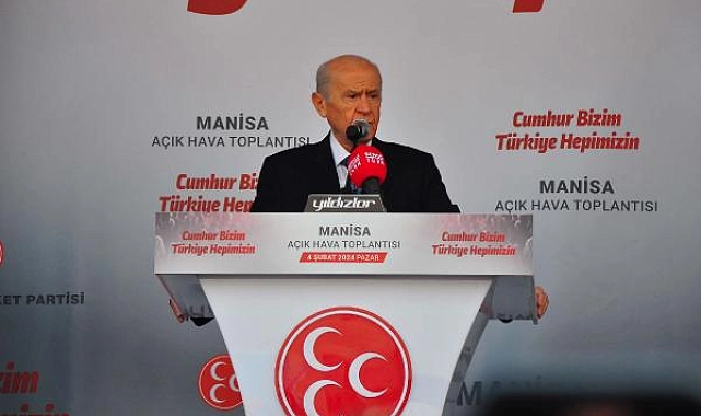 Devlet Bahçeli, 'Cumhur Bizim Türkiye Hepimizin' temalı açık hava toplantısının ikincisini Manisa'da düzenledi. Öğle saatlerinde geldiği Şehzadeler ilçesindeki Manisa Cumhuriyet Meydanı'nda vatandaşlara seslenen Bahçeli, "14 Mayıs ve 28 Mayıs 2023 tarihlerinde yapılan cumhurbaşkanlığı ve milletvekilliği genel seçimleriyle önümüze çıkarılan sanal korkuluklar yıkıldı, banal engeller aşıldı. Cumhur, demokratik iradesiyle vaziyet alıp, Türk ve 'Türkiye Yüzyılı'nın meşalesini yaktı. 5 yıl önce Manisa'yı tekrar ehline emanet ettiniz, ehliyet ve liyakat sahibi şehreminini bağrınıza bastınız. Sizlerden Allah razı olsun. 8 ay önce gene Manisa'ya sahip çıktınız, sağlam iradeyi seçerek istikrar sürsün, Türkiye büyüsün tercihinde bulundunuz. Bizi hiçbir zaman mahcup etmediniz. Hiçbir zaman dara düşürmediniz, zora mahkum etmediniz. 56 gün sonra da 14 Mayıs ve 28 Mayıs'ın tamamlayıcı üçüncü halkası olan yerel seçimler yapılacaktır. İnanıyorum ki Manisa yine sevdalılarına kucağını açacaktır. İnanıyorum ki Manisa varlığına ve birliğine ipotek koydurmayacaktır. Çünkü Manisa bizim, Türkiye hepimizindir. Partimizi temsilen Cumhur İttifakı'nın büyükşehir belediye başkan adayı Cengiz Ergün'ü bir kez daha iradenize ve takdirinize emanet ediyorum. Bu muhteşem seslenişinizden anlıyorum ki Manisa'da sahte demokratlara, yalan bezirganlarına, yıkım elebaşlarına, DEM'lenmiş siyasi eyyamcılara müsamaha yoktur, müsaade yoktur, mükafat yoktur" dedi.