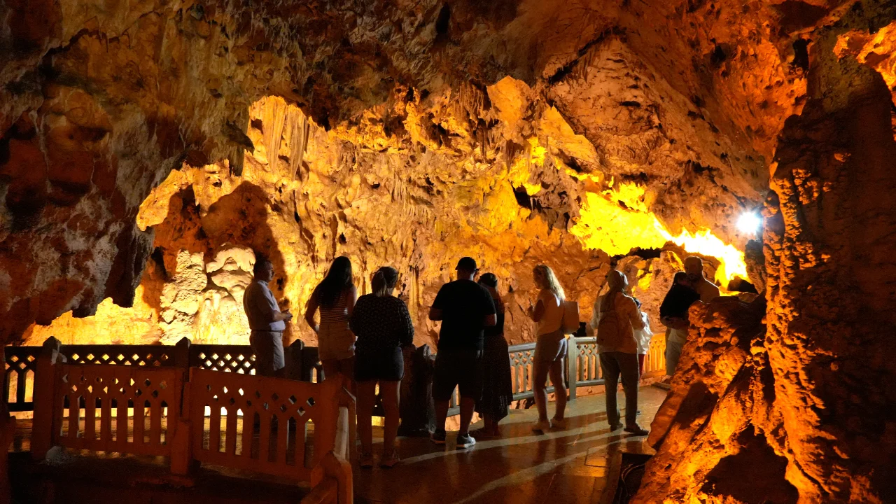 Kent merkezine 13 kilometre uzaklıkta Sarpgüney Tepesi'nin kalkerli yamacında bulunan mağara 1952'de Dr. Temuçin Aygen'in yaptığı çalışmaların ardından 1966'da turizme açıldı.