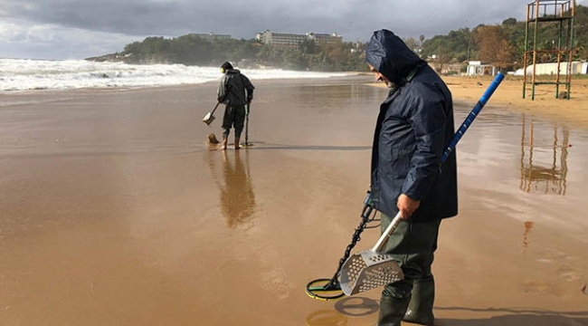 Antalya'da fırtınadan sonra dev dalgaların getirdiği değerli eşyaları sahilde dedektörle dolaşıp arayan vatandaş, "Yüzük, küpe ne çıkarsa, ekmeğimizi bundan çıkarıyoruz" dedi.