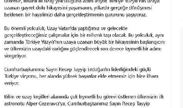İletişim Başkanı Altun, sosyal medya hesabından, Uluslararası Uzay İstasyonu'nda görev yapacak Türkiye'nin ilk uzay yolcusu Alper Gezeravcı'ya ilişkin paylaşımda bulundu. Altun, 'Gurur Duy Türkiye' etiketiyle yaptığı paylaşımda, "Türkiye olarak, tarihi bir ana tanıklık ediyoruz. Ülkemiz, insanlı ilk uzay yolculuğuna adım atıyor. Türkiye Yüzyılı'nın uzaya uzanan gayret dolu hikayesini yaşamanın, yıllardır gerçeğe dönüşmesi beklenen bir hayalimizi daha gerçekleştirmenin gururunu yaşıyoruz. Bu önemli yolculuk, Uzay Vatan'da yaptığımız ve gelecekte gerçekleştireceğimiz çalışmalar için bir mihenk taşı olacak. Bu yolculuk, aynı zamanda Türkiye Yüzyılı'nın uzaya uzanan büyük bir hikayesinin başlangıcını ve ülkemizin uzaydaki varlığını güçlendirecek son derece kıymetli bir adımı simgeliyor. Cumhurbaşkanımız Sayın Recep Tayyip Erdoğan'ın liderliğindeki güçlü Türkiye vizyonu, her alanda yüksek başarılar elde etmemiz için bize ilham veriyor. Bilim ve uzay keşifleri alanında çok kıymetli bu görevi üstlenen ülkemizin ilk astronotu Alper Gezeravcı'ya, Cumhurbaşkanımız Sayın Recep Tayyip Erdoğan'ın öncülüğünde ve Sanayi ve Teknoloji Bakanlığımız ile Türkiye Uzay Ajansı Başkanlığımız koordinasyonunda gerçekleşen bu yolculukta başarılar diliyorum" diye konuştu.