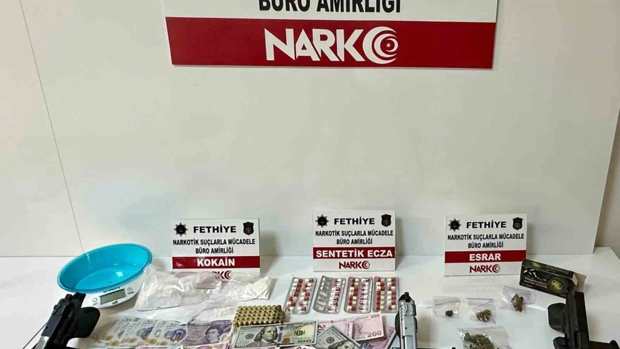 Muğla Emniyet Müdürlüğü Narkotik Suçlarla Mücadele Şube Müdürlüğü ile İstihbarat Şube Müdürlüğünce Fethiye ilçesinde yapılan müşterek çalışmada; Bin 256 gram esrar, 101 gram kokain, 49 adet sentetik ecza, 12 kök Hint keneviri, 3 adet ruhsatsız tabanca, 74 adet fişek, suçtan kazanıldığı değerlendirilen 132 bin 800 TL, 700 Dolar, 220 Pound, 70 Euro para ele geçirildi.