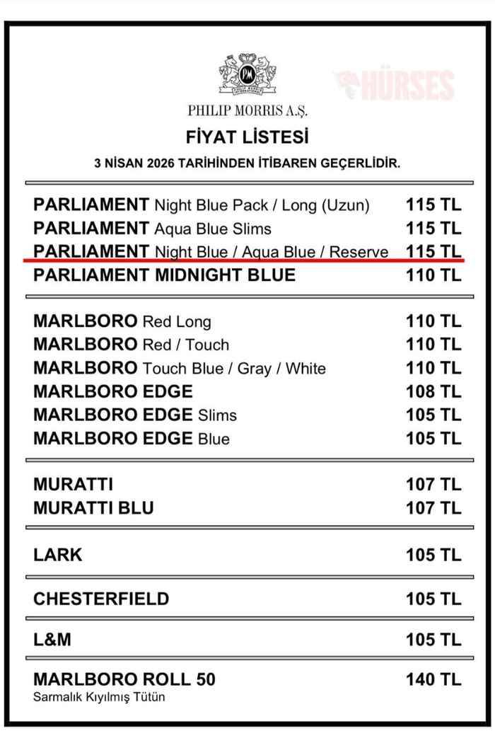 Bugün gelen zamla birlikte Parliament Night Blue, Aqua Blue ve Reserve serilerinde fiyatlar 5 TL artarken, 110 TL bandındaki ürünler 115 TL seviyesine çıktı.