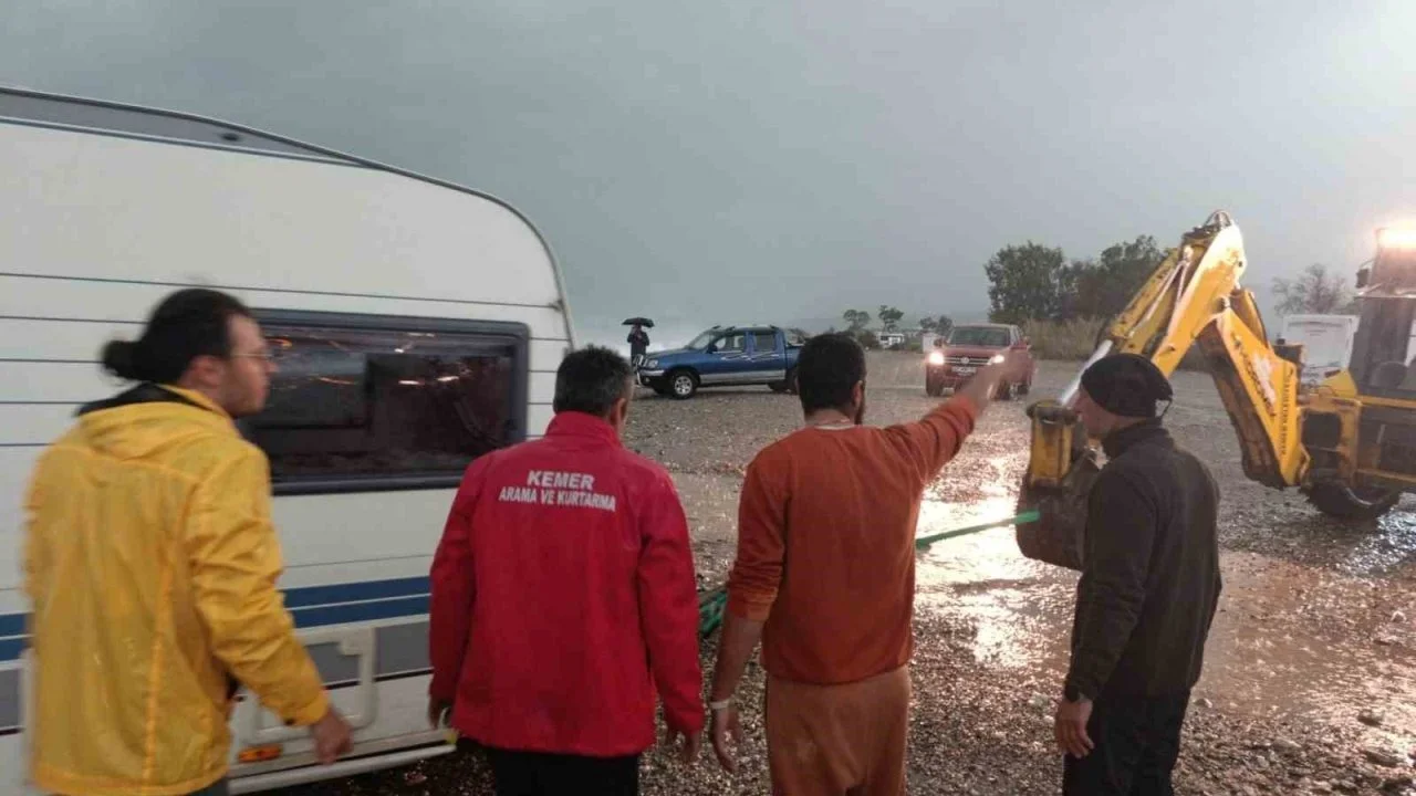 Kemer’de bugün sabah saatlerinde başlayan ve öğle saatlerinde etkisini artıran sağanak sonrası Kemer Belediyesi ekipleri teyakkuza geçti. Ağva Deresi’nin denizle buluştuğu Çamyuva sahilinde karavanlarında mahsur kalan Rus turistleri Kemer Belediyesi Afet İşleri Müdürlüğü ve Kemer Arama Kurtarma Derneği (KEMKUT) ekipleri, Kemer Belediyesi Fen İşleri Müdürlüğü’ne ait bir kepçe yardımı ile kurtardı. Turistlerin olduğu karavanı bulunduğu yerden çeken ekipler, içerisinde kimsenin bulunmadığı bir başka karavanı da kıyıya çekti.
