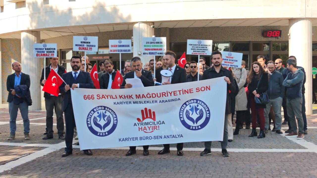 Kariyer Büro Sendikası, 2014’ten beri “Taşra” adı altında mağdur edilen kariyer mesleklerin taleplerini dile getirmek amacıyla Antalya Defterdarlığı önünde basın açıklaması yaptı. Türkiye genelinde alınan bir günlük iş bırakma kararı kapsamında gerçekleştirilen açıklamayı, Kariyer Büro Sendikası Antalya İl Temsilcisi İhsan Pardı yaptı.