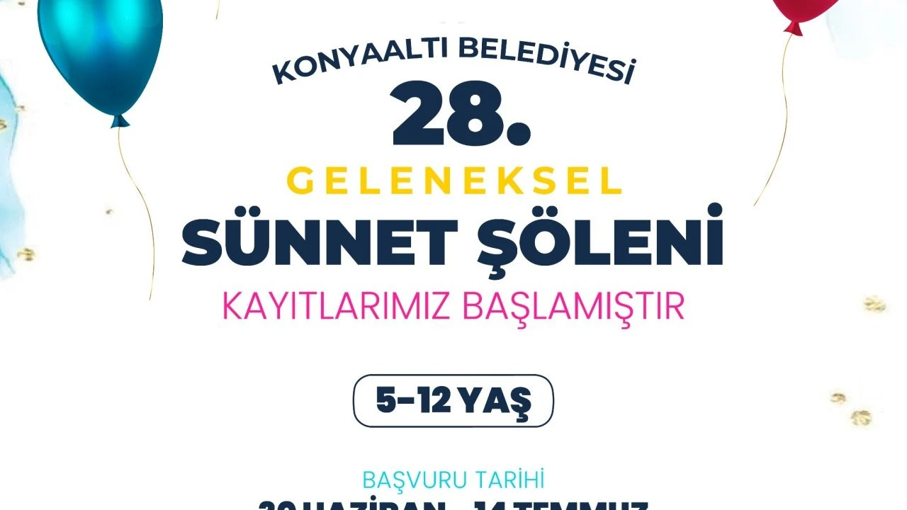 Konyaaltı Belediyesi tarafından düzenlenen, her yıl yüzlerce çocuğun yaralandığı 'Geleneksel Sünnet Şöleni' kayıtları başladı. 5-12 yaş aralığındaki çocukların kabul edileceği 'Geleneksel Sünnet Şöleni'ne başvurular, 30 Haziran-14 Temmuz tarihleri arasında Konyaaltı Belediyesi Ana Hizmet Binası’ndaki Kültür ve Sosyal İşler Müdürlüğü’nde yapılacak. Konyaaltı Belediyesi yetkilileri, her yıl olduğu gibi bu yıl da çocuklar için hem eğlenceli hem de güvenli bir ortam hazırladıklarını kaydetti. Konuyla ilgili detaylı bilgi almak isteyen vatandaşlar, '0 242 245 55 25' numaralı telefondan başvuru süreci hakkında bilgi alabilecek.