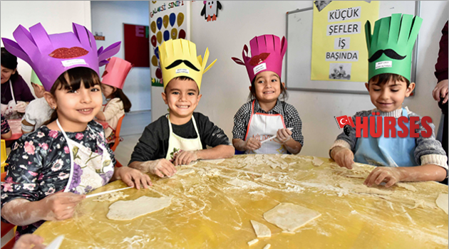 Muratpaşa Belediyesi'nin Dutlubahçe Kreşi'nin minik öğrencileri, Yerli Malı Haftası dolayısıyla erişte kesti