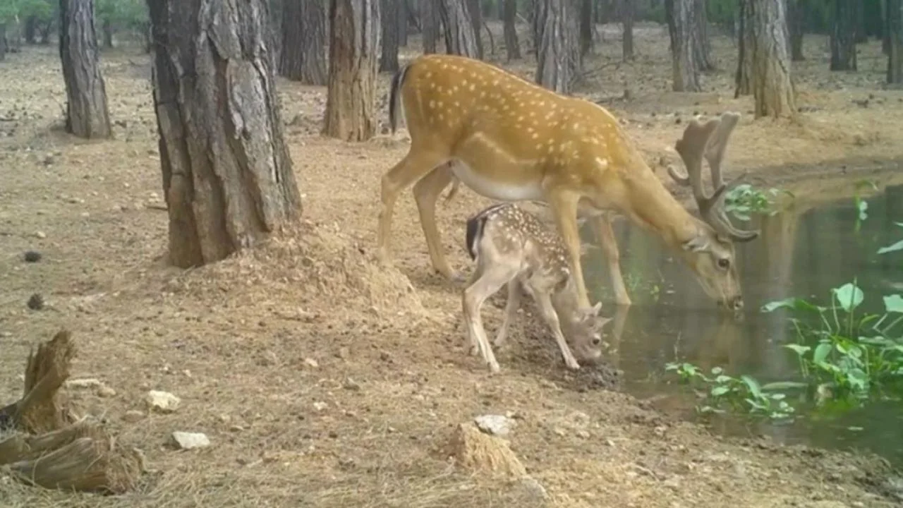 Görüntülerde, alageyik ve yavrularının üretme istasyonundaki göletten su içtiği anlar yer alıyor.