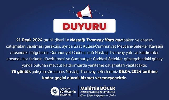 Antalya Büyükşehir Belediyesi’nden yapılan açıklamada Cumhuriyet Meydanı ve çevresinde yapılacak bakım onarım ve tadilat işlemleri dolaysısıyla tramvayın kullanılmayacağını açıkladı. Yapılan açıklama şu şekilde: