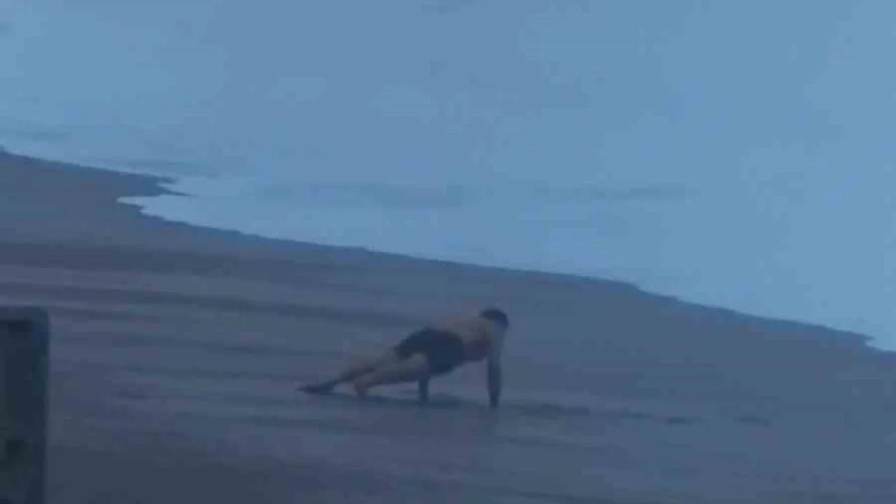 Sahilde şınav çekti, 2 metrelik dalgaları görünce koşarak kaçtı