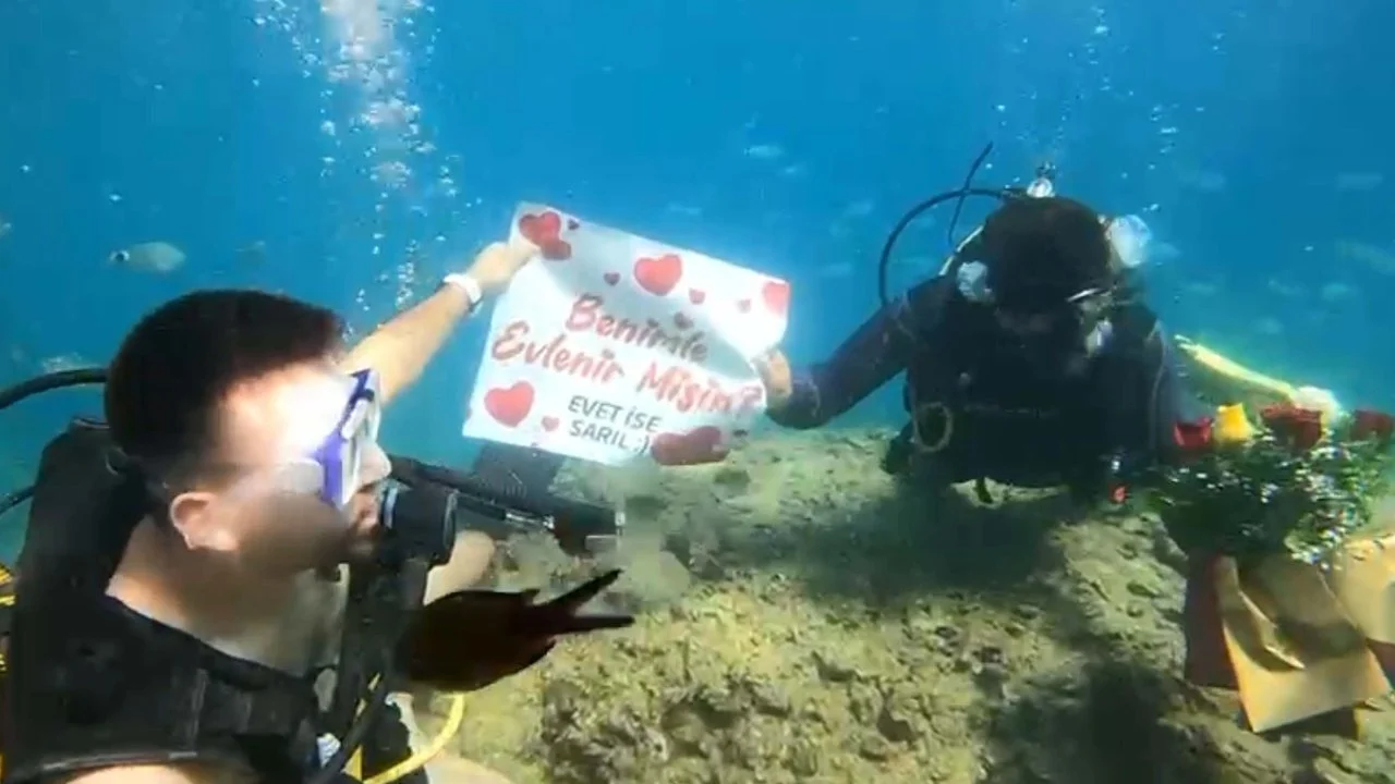 Kentte restoran müdürü olarak görev yapan Muhammet Akbıyık, uzun süre birlikte olduğu Ezgi Uysal'a sürpriz evlilik teklifi planladı. Çift, Okurcalar Mahallesi'ndeki dalış okulunun eğitmenleri eşliğinde denize tüplü dalış yaptı. Bu sırada Akbıyık, önceden hazırladığı 'Benimle evlenir misin' yazısının yer aldığı kağıdı açıp Uysal'a evlilik tekli yaptı. Teklifinin kabul edilmesinin ardından Akbıyık, Uysal'a yüzük taktı. Çiftin mutlu anları su altı kamerasıyla kaydedildi.