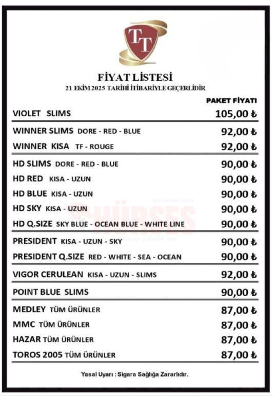 Aşağıda, 21 Ekim 2025 tarihli güncel fiyat listesine göre revize edilmiş haliyle TT Sigara Grubu’na ait sigara fiyatları yer almaktadır.