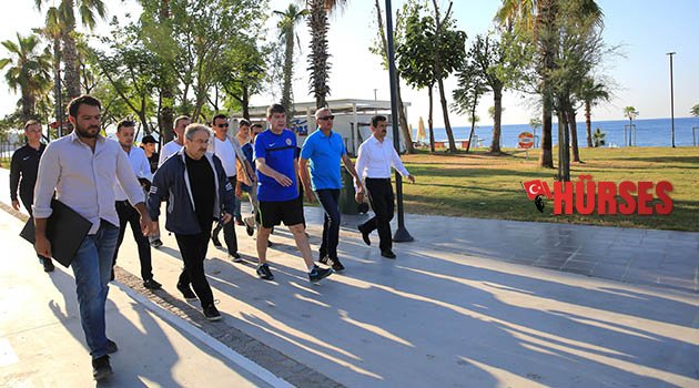 Büyükşehir Belediye Başkanı Menderes Türel, sabah sporunda Konyaaltı Sahili’ni denetledi. Tespit ettiği bazı aksaklıkların giderilmesi için bürokratlarına talimat veren Türel, projenin dışına çıkılmaması hususunda, işletmecileri uyardı